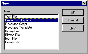Det första vi ska skapa är ett så kallat projekt. Projektet är en sammanställning av vad vi vill skapa, och vad vi utgår ifrån. Det finns motsvarigheter i de flesta programmeringsspråk. Välj menykommandot [File - New], så kommer dialogrutan ‘New’ fram. Välj ‘Project Workspace och klicka på ‘OK’...