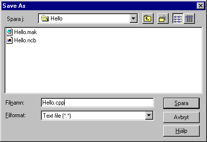 Om Filformat är inställt på filtret ‘*.*’ så att alla filer syns, ser vi de två filer vi redan skapat. Det är de som beskriver projektet. Nu ska vi spara en ny fil i samma katalog. Fyll i namnet ‘Hello.cpp’. Filnamnstillägget ‘.cpp’ betyder att denna textfil ska kompileras enligt programmeringsspråket C++.