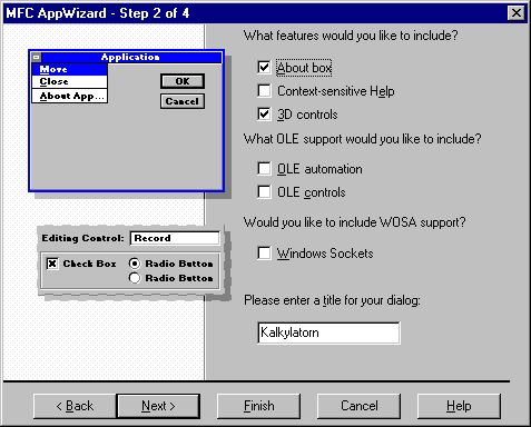 · Projektet innehåller inget dokument, så 'File'-menyn och 'Edit'-menyn behövs heller inte. Spara på disk och sådant finns inte alls med i projektet. Skulle man vilja spara något måste man själv lägga till den kod som behövs, vilket faktiskt inte blir så mycket, eftersom man använder klasser i MFC för att göra det mesta jobbet.