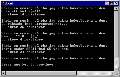 Programmet ska svara: ”Meningen innehåller <antal> bokstäver.