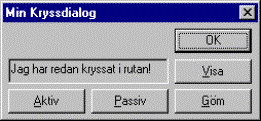 Detta och mer därtill kommer vi som sagt att utveckla efterhand som vi tittar på diverse kontroller. Vi börjar i detta kapitel med kontrollen för kryssruta. Under Windows-95 har man visserligen bytt ut krysset mot en bock, men vi behåller den gamla beteckningen i stället för att börja tala om ‘förbockningsrutor’.